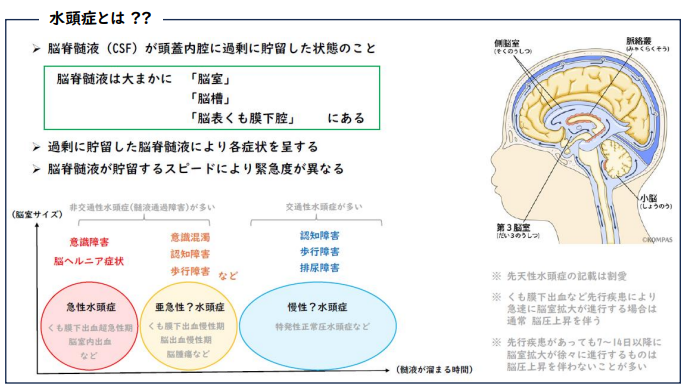 脳や脊髄は髄膜(くも膜)という膜でできた袋で、この中を満たすお水の中にぷかぷか浮いています。このお水のことを脳脊髄液と言います。脳脊髄液は脳脊髄への栄養因子やホルモンの運搬、老廃物の排泄、外力の緩衝など様々な機能があると言われています。通常、脳脊髄液は適切な量になるように産生と吸収がうまく調整されていますが、様々な原因で脳脊髄液が増えてしまいます。