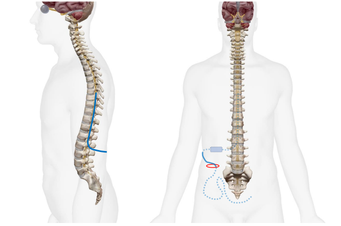 背中に約3cmの皮膚切開をして、腰椎穿刺を行い、髄液腔にカテーテルを挿入し、側腹部までカテーテル、バルブを皮下に植え込みます。側腹部に約4cmの皮膚切開をし、腹腔内にカテーテルを挿入し、全てのシステムを皮下に埋めこみ、傷を閉じて終了です。