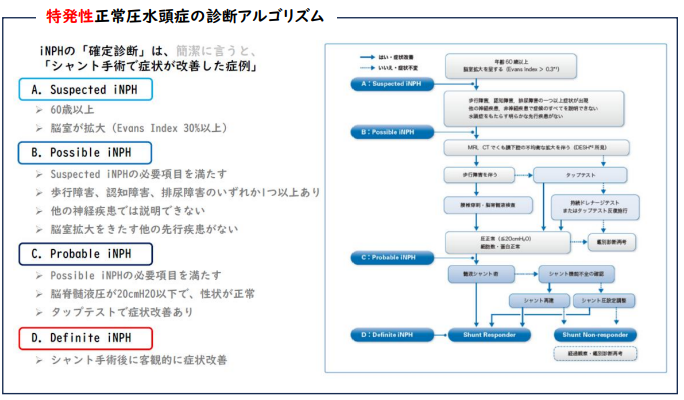 特発性正常圧水頭症の診断アルゴリズムを用いて診断していきます。頭部CTやMRIで脳室の拡大がある場合は、特発性正常圧水頭症が疑われます(Suspected iNPH)。