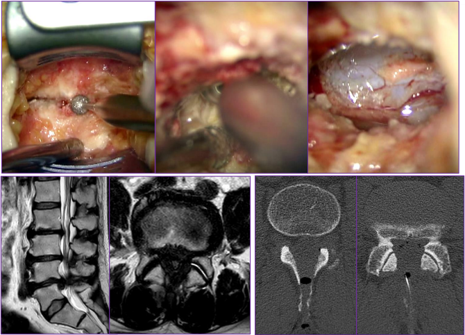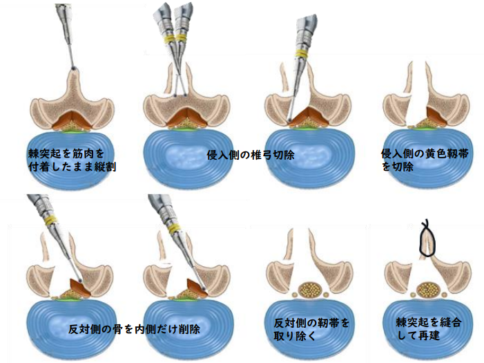 小さな皮膚切開(1椎間であれば2.5cm程)で、椎弓と呼ばれる骨の一部を削り、厚くなった靭帯や飛び出した椎間板を取り除きます。手術は、手術顕微鏡を使って行います。